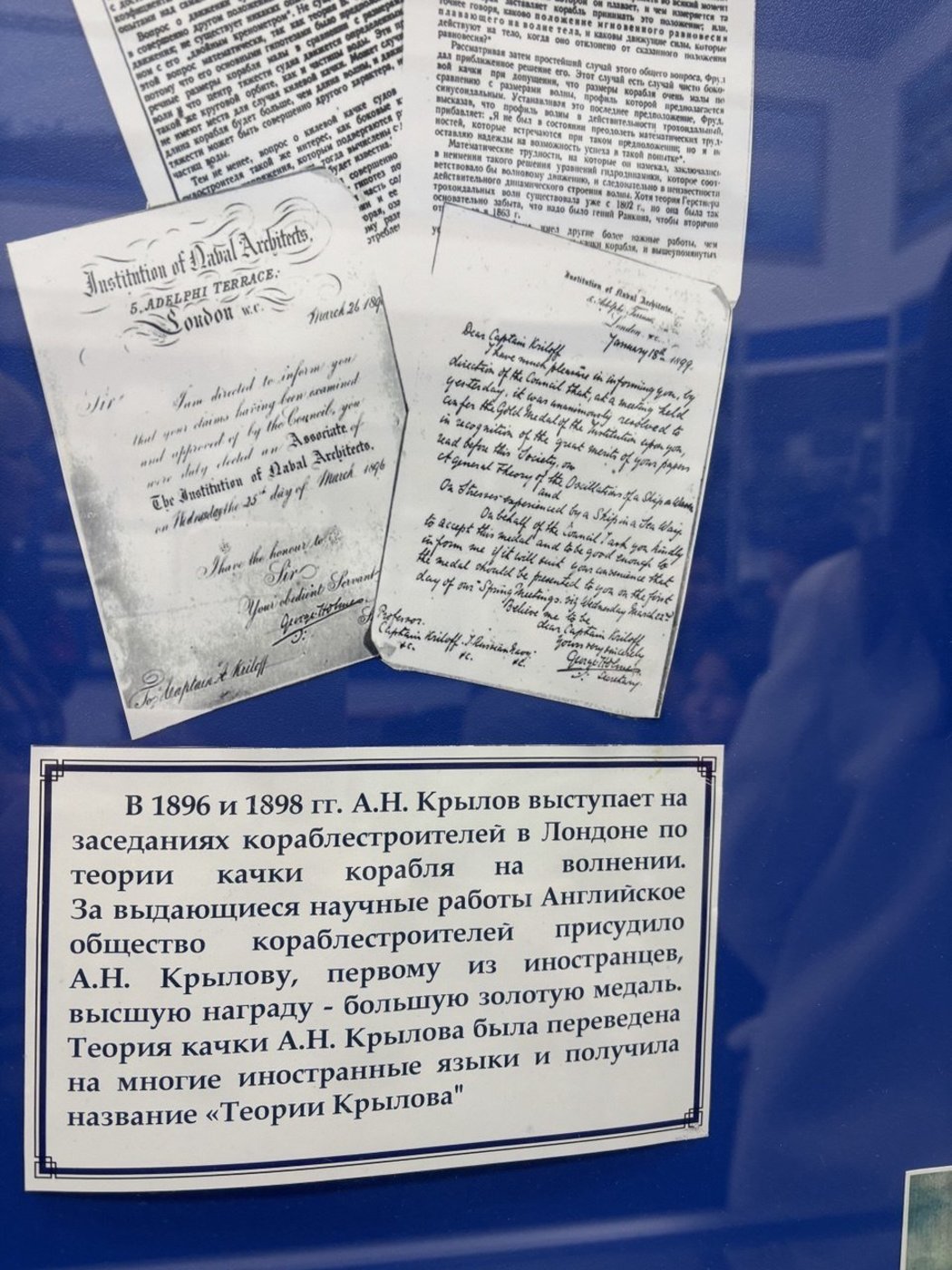 Мемориальный музей ученого с мировым именем А.Н. Крылова открыт в 1984 году. А.Н. Крылов был основоположником русской научной школы кораблестроения. В развитии отечественного кораблестроения и приложения математики к решению вопросов морского дела и техники сыграл огромную роль, которую можно сравнить лишь с ролью Д.И. Менделеева — в химии; Н.Е. Жуковского — в авиации, К.Э. Циолковскиого — в теории реактивного движения; И.П. Павлова — в физиологии.
