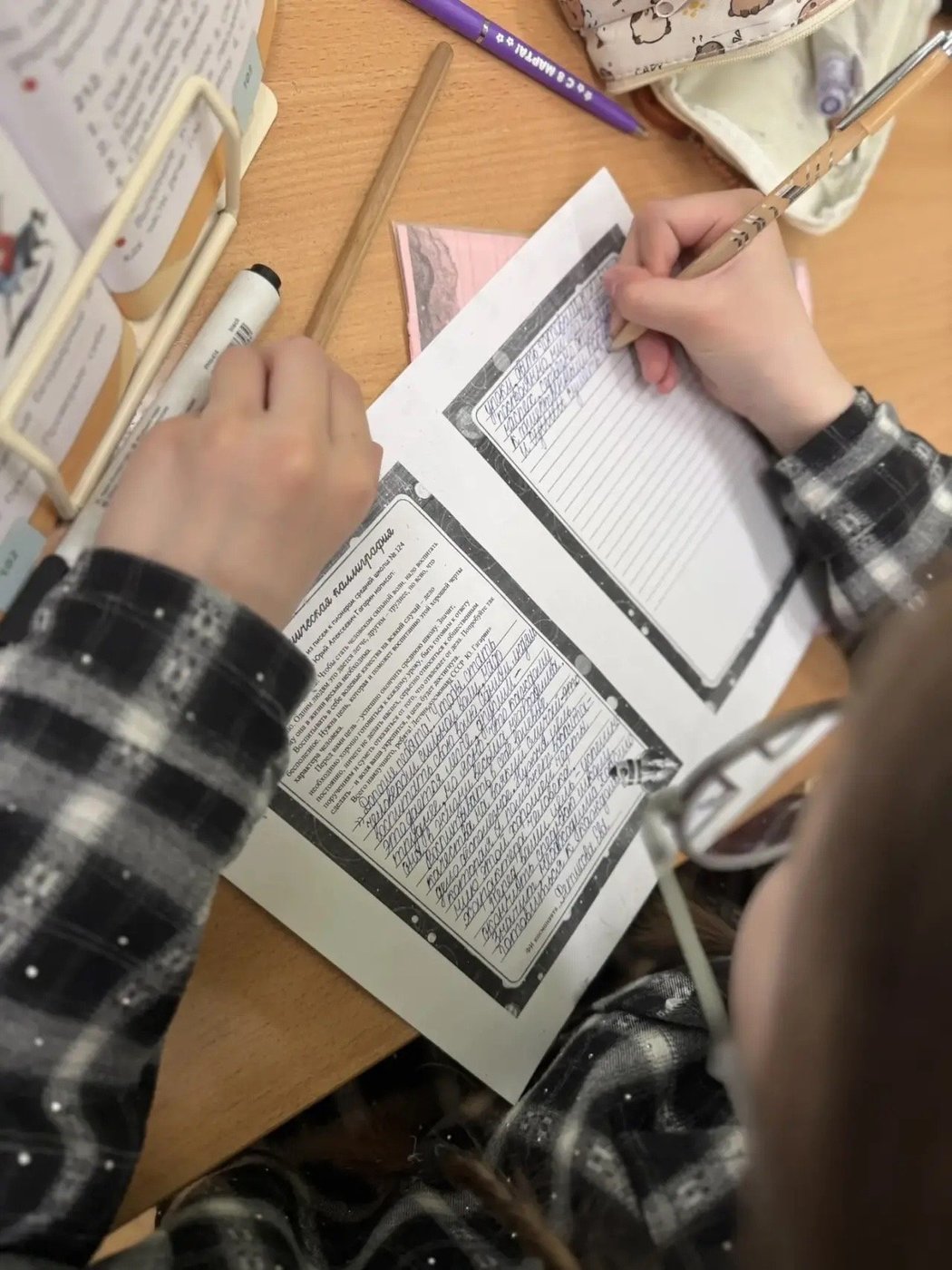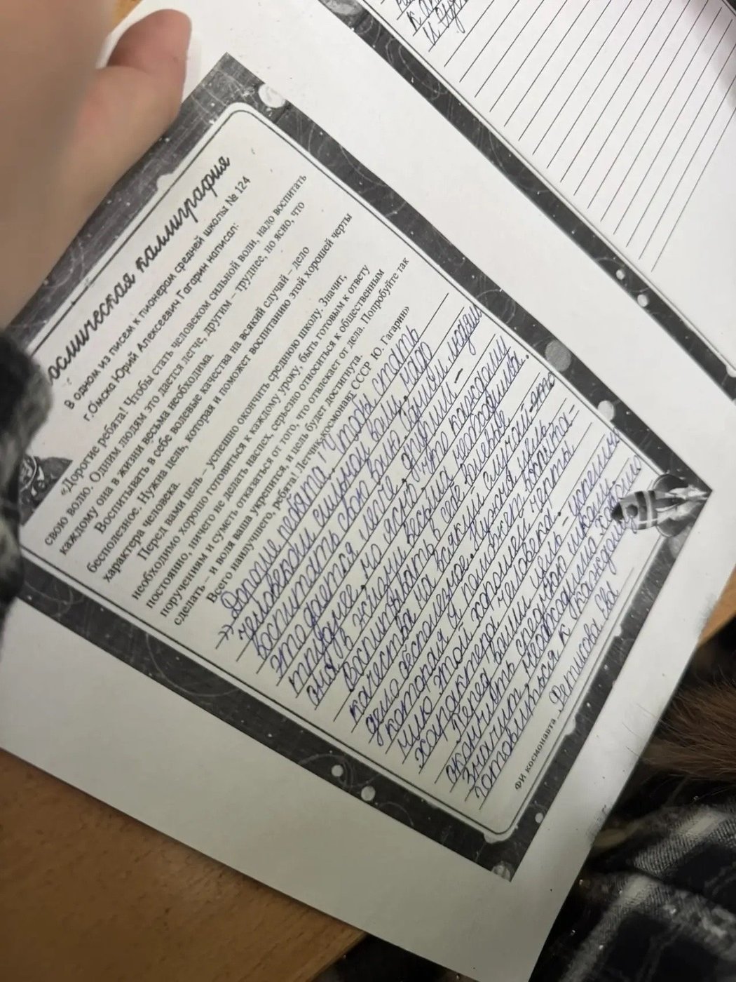 В 4 «Ж» классе прошёл творческий конкурс «Космическая каллиграфия», приуроченный ко Дню Космонавтики. Мероприятие стало ярким событием в школьной жизни и объединило учеников вокруг темы космоса и искусства красивого письма. Ребята с большим энтузиазмом подошли к заданию: им предстояло оформить тексты на космическую тему, продемонстрировав аккуратность, фантазию и владение каллиграфией. Каждая работа получилась уникальной: одни участники выбрали строгий и чёткий стиль письма, другие добавили творческие декоративные элементы, создавая настоящие «космические» композиции.