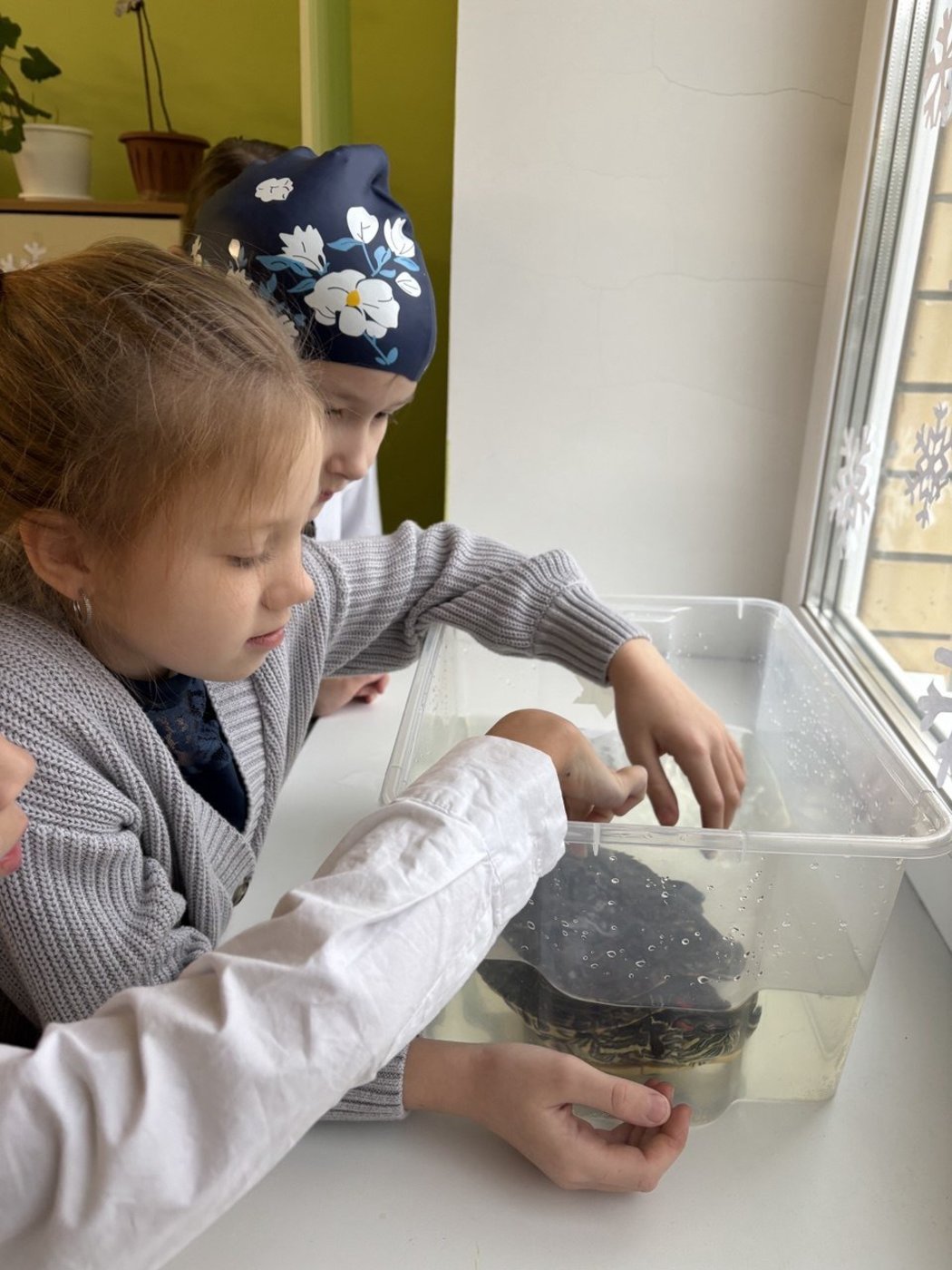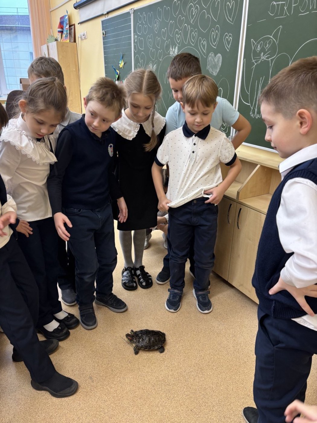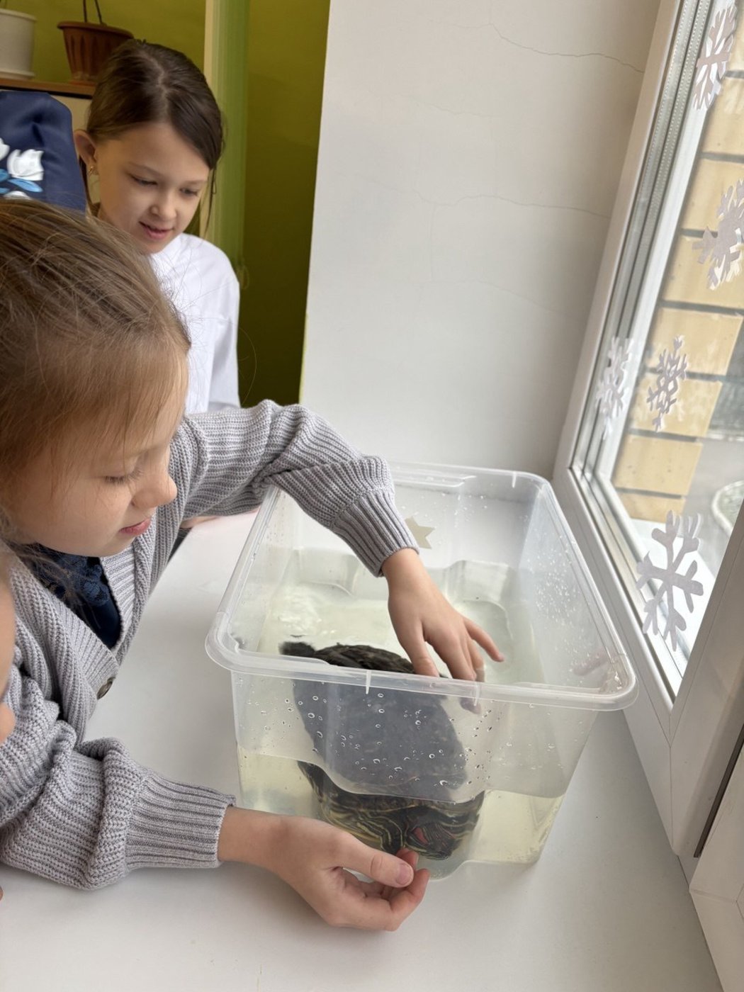 Сегодня на уроке окружающего мира третьеклассники получили возможность понаблюдать за живой черепахой. Черепаха Матильда относится к виду красноухих из семейства пресноводных американских черепах.