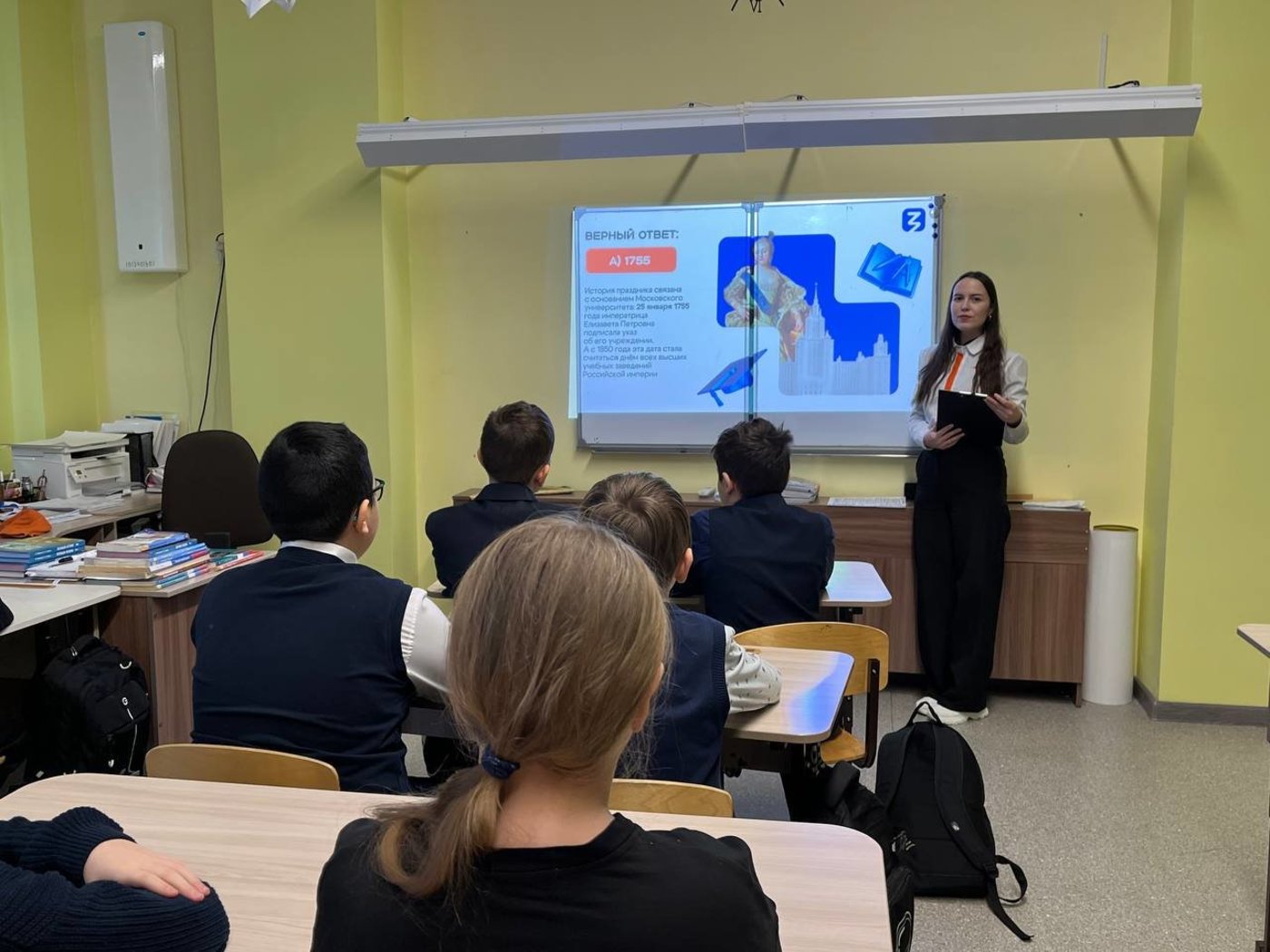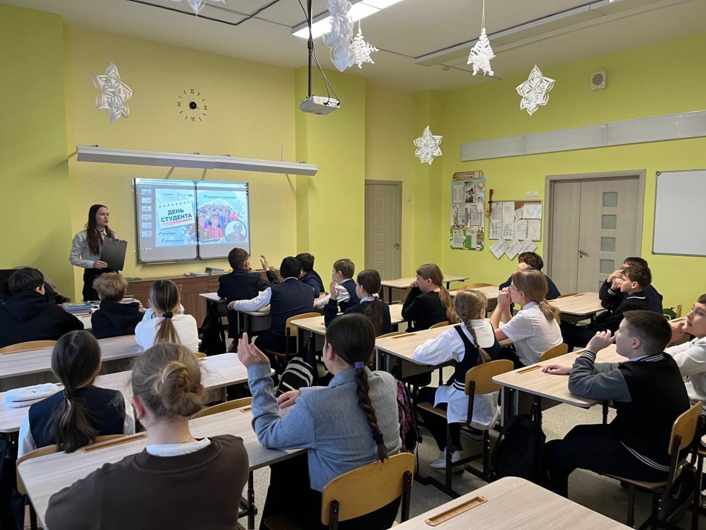 Учащиеся окунулись в прошлое, посмотрев видеоролик об истории Дня российского студенчества, и с интересом отвечали на каверзные вопросы: