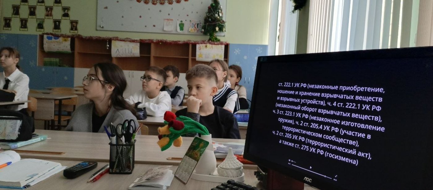 С 15 декабря по 18 декабря в СОШ 1 в целях противодействия идеологии терроризма в Российской Федерации и с учетом актуальных террористических угроз организован просмотр видеороликов, направленных на повышение бдительности населения и его информированности о действиях украинских вербовщиков и последствиях совершения по их указанию диверсионно-террористических актов.