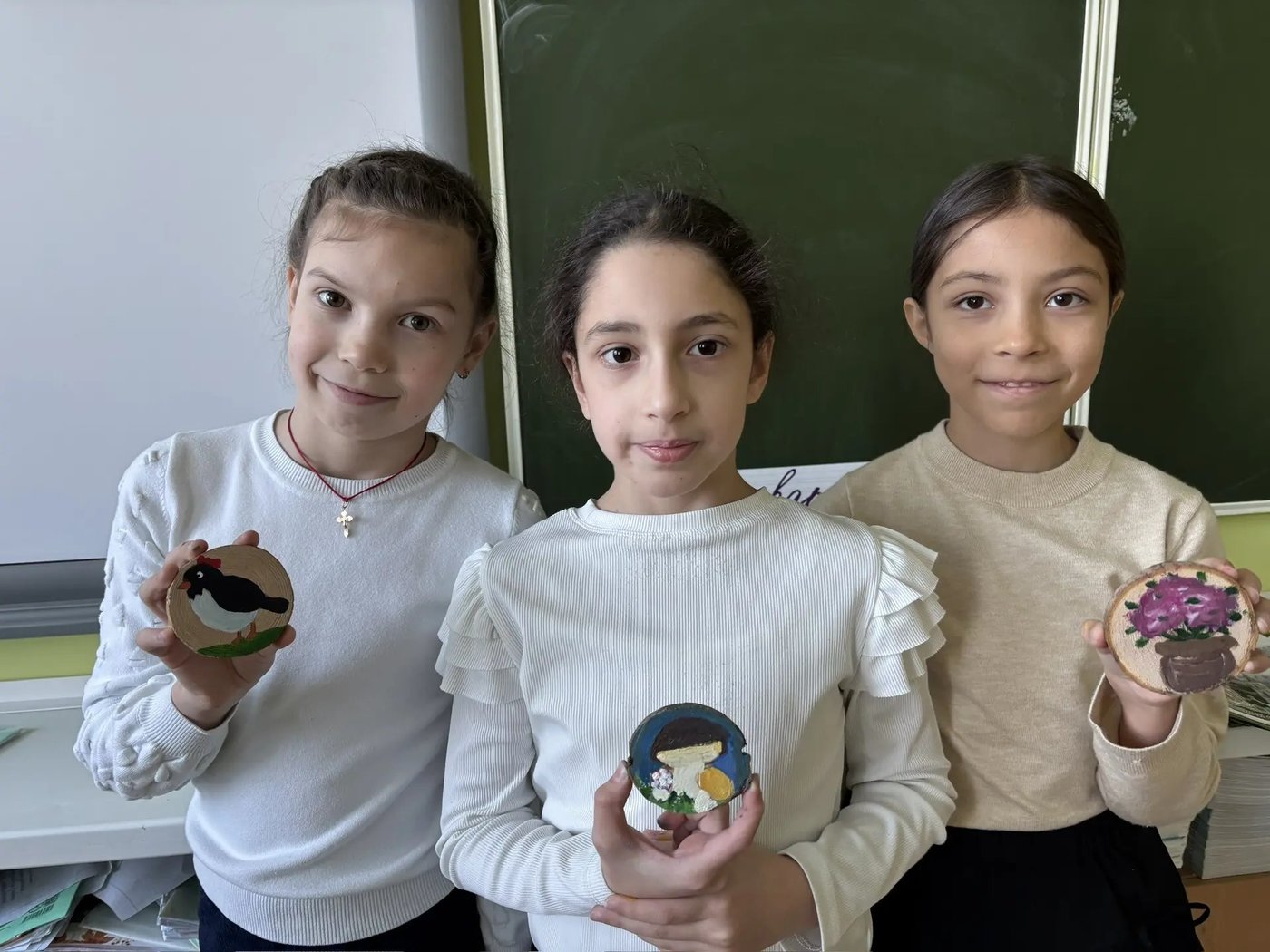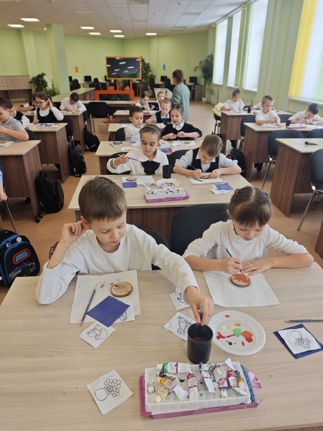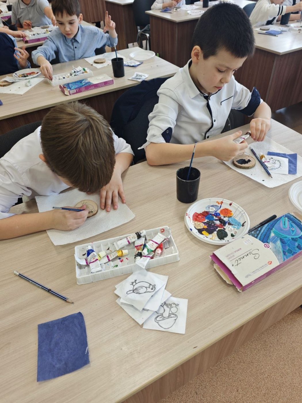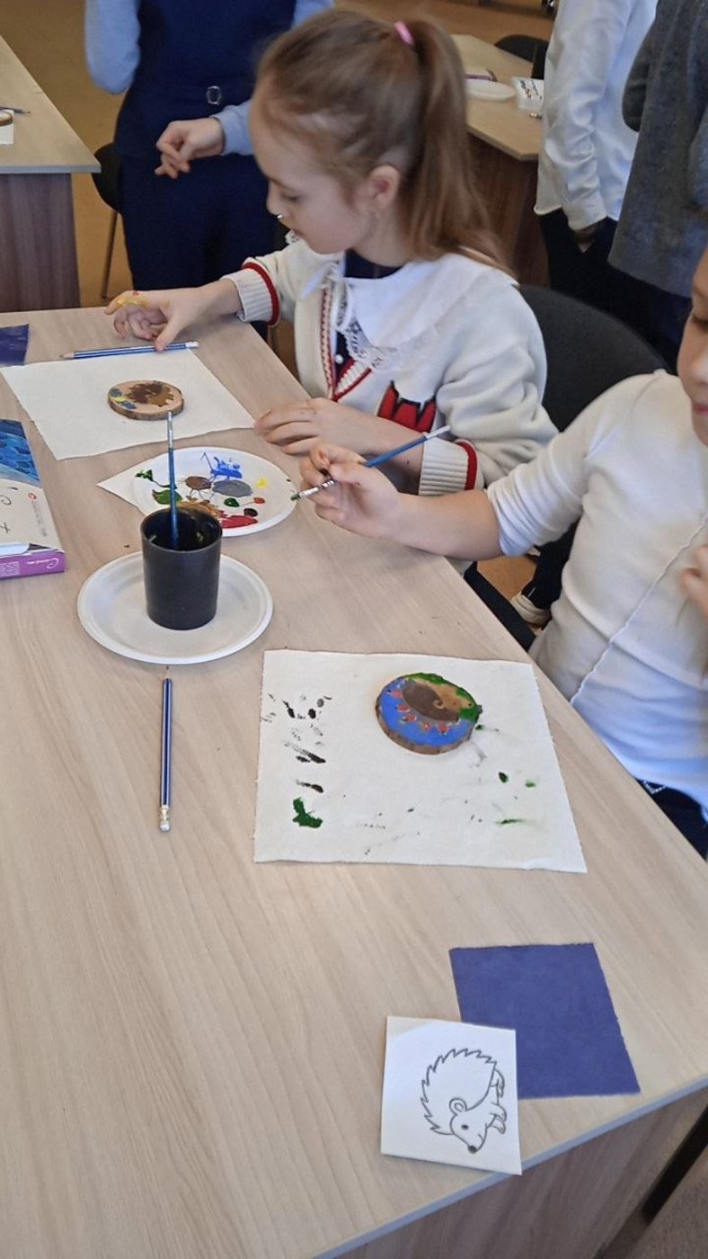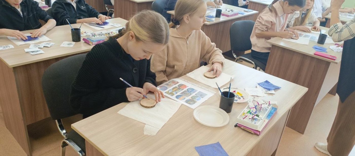 После экскурсии по выставке, у ребят была возможность самим на мастер-классе нарисовать на спиле дерева небольшую картину.