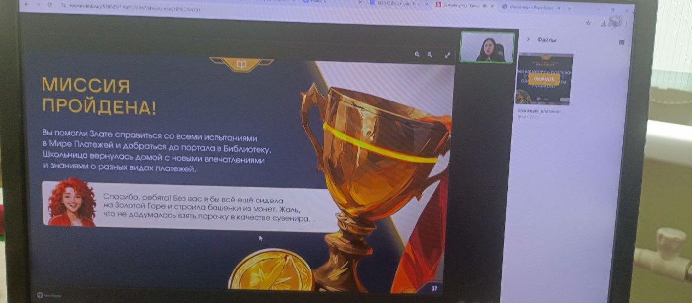 Урок на тему "Как менялись платежи: от натурального обмена до оплаты улыбкой?" познакомил пятиклассников с историей платежей — от натурального обмена (когда люди менялись товарами напрямую) до современных электронных денег. Ученики узнают, как эволюционировали деньги — от ракушек и золота до привычных монет и купюр, с современными способами оплаты — обсуждение, какие преимущества и недостатки у каждого из них (наличные, банковские карты, электронные кошельки, со способами защиты от мошенников — ученики узнают, как не стать жертвой мошенников в интернете, как защитить свои деньги и личные данные, о перспективах развития платежей — ученикам предлагается задуматься над будущим платёжных систем, включая инновационные методы вроде «оплаты улыбкой», основанной на распознавании лиц и эмоций. Урок построен в виде занимательной игры, ученики вместе с Хранительницей Платежей разбираются в видах оплаты и помогают школьнице из Города Финансов, случайно оказавшейся в загадочном Мире Платежей, добраться до портала. Знания закрепляются с помощью интерактивных заданий.