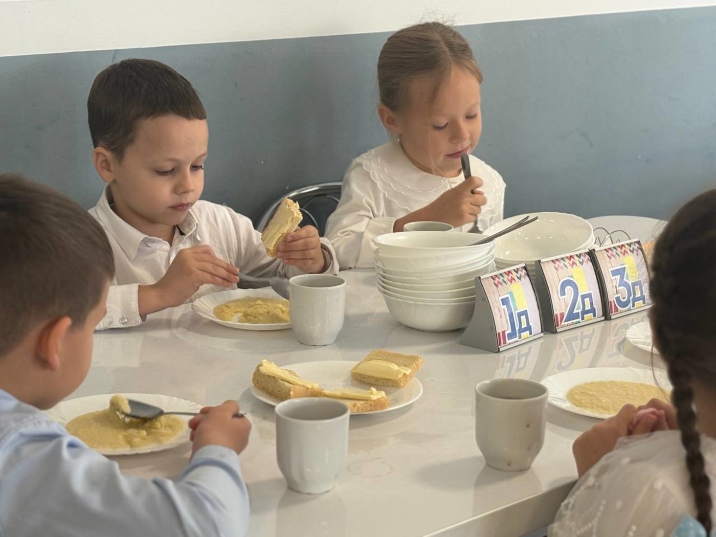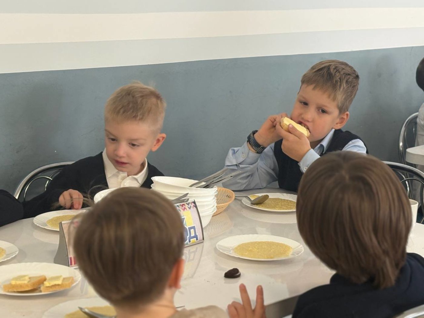 А еще говорят: "За общим столом и еда вкуснее". Пшенная каша, бутерброд с маслом и чай с лимоном показались первоклашкам сегодня особенно аппетитными.