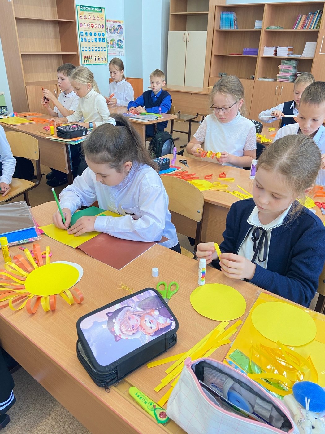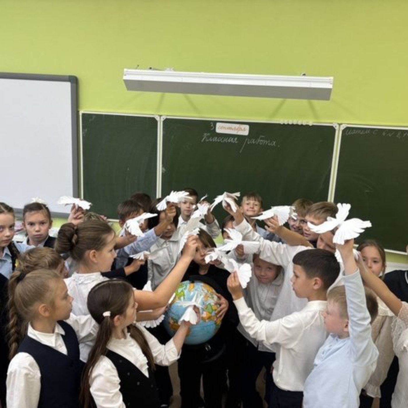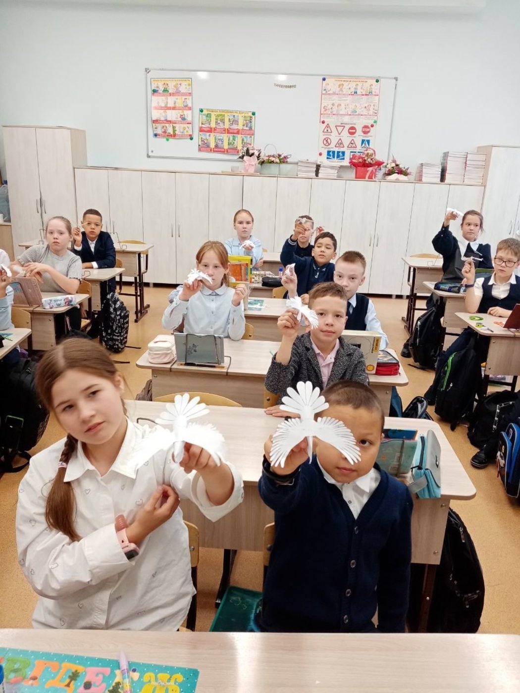 День мира в 2025 году проходит под девизом «Действуйте сейчас во имя мира». Ученики начальной школы сделали поделки из бумаги "Солнышко для друга" и плакаты "Дети за мир на планете", а так же приняли участие в акции "Мы за мир!", изготовили белых голубей - символ праздника.