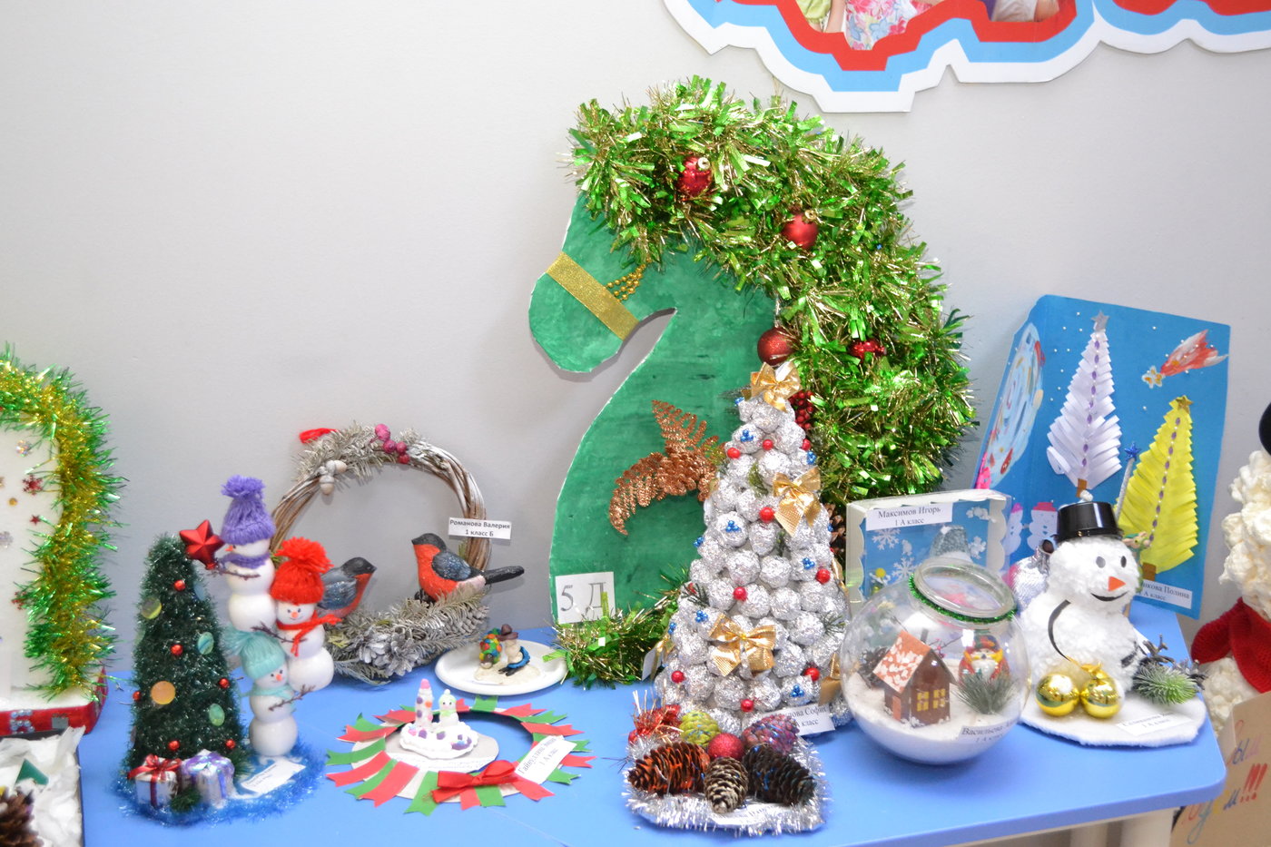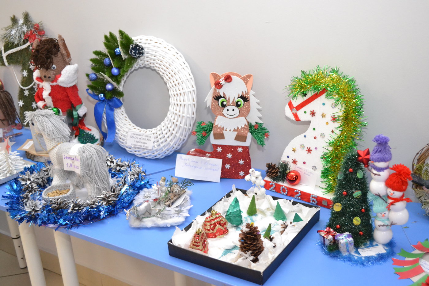 Проявив творчество, смекалку, огромное трудолюбие, учащиеся вместе с родителями изготовили настоящие шедевры! Поделки получились очень оригинальные и разнообразные. На выставке можно увидеть композиции «Новогодняя елка», «Символ года» и многое другое.