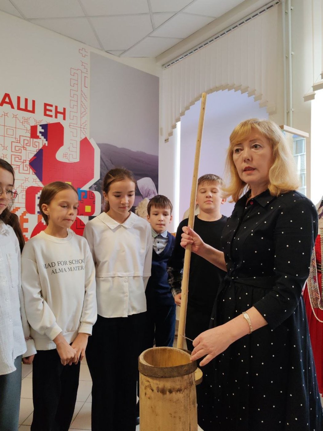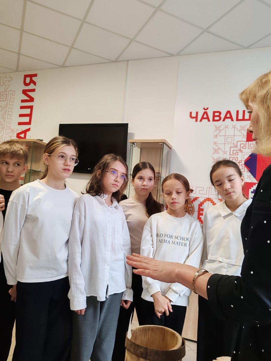 В 5Д классе урок чувашского языка по теме "Кукамайпа кукаҫи патӗнче - у бабушки и дедушки" прошёл в школьном краеведческом музее.