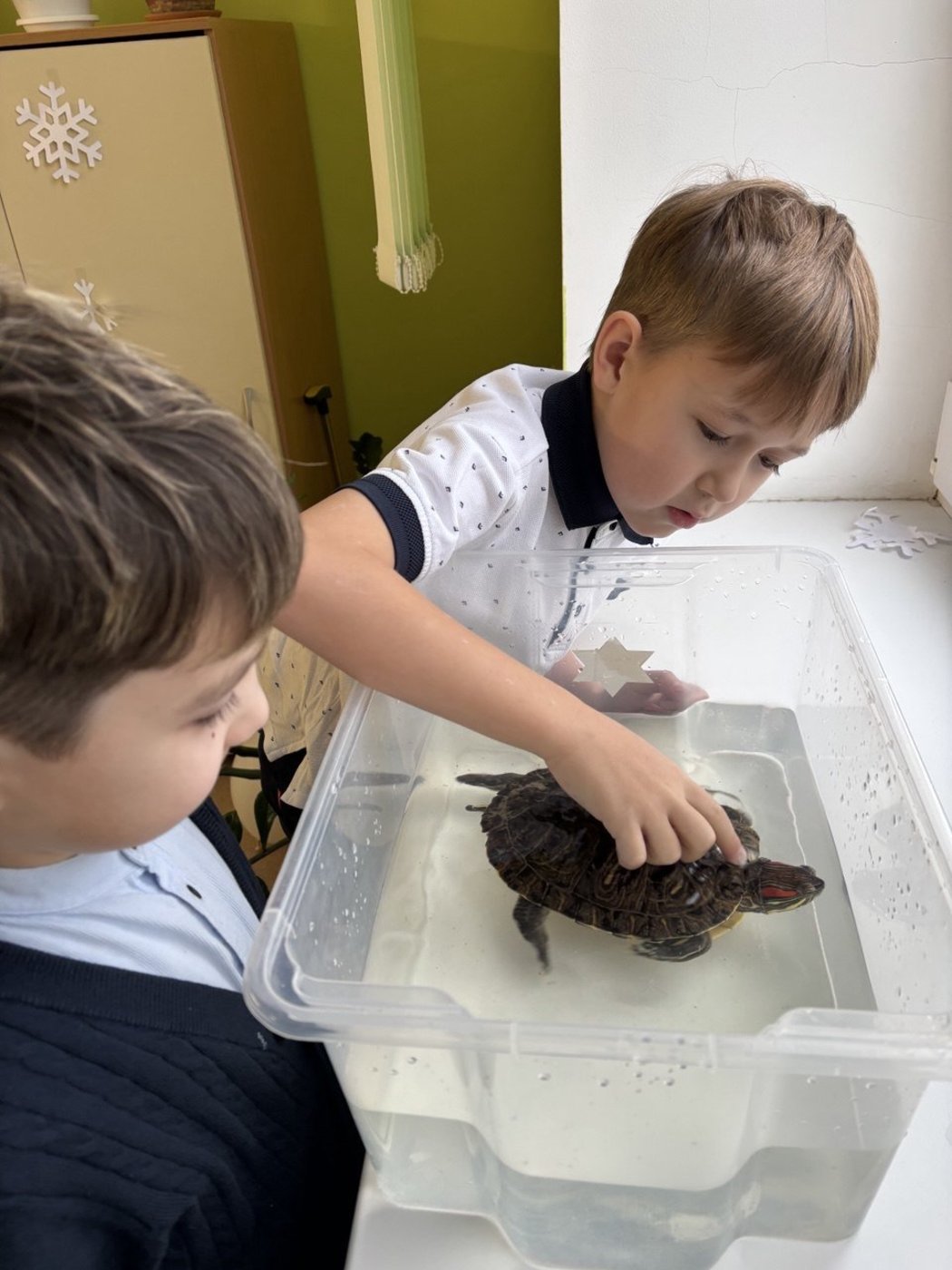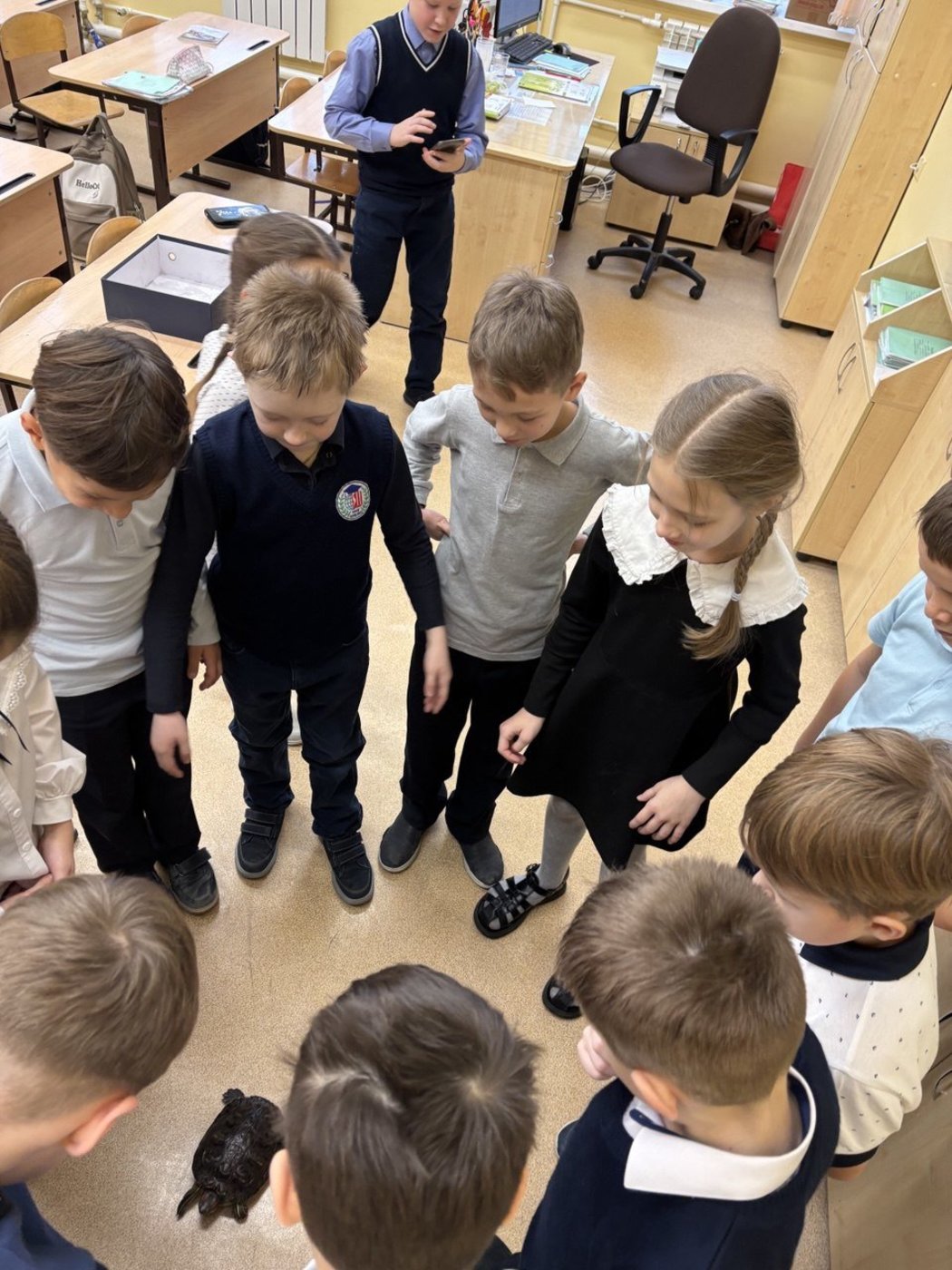 Сегодня на уроке окружающего мира третьеклассники получили возможность понаблюдать за живой черепахой. Черепаха Матильда относится к виду красноухих из семейства пресноводных американских черепах.