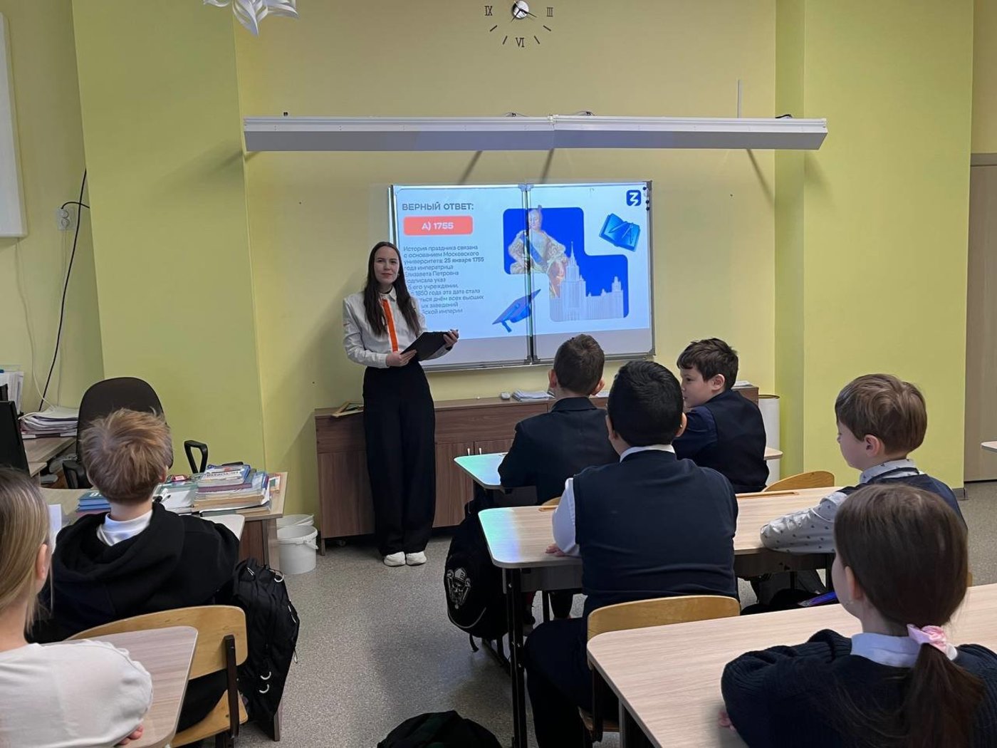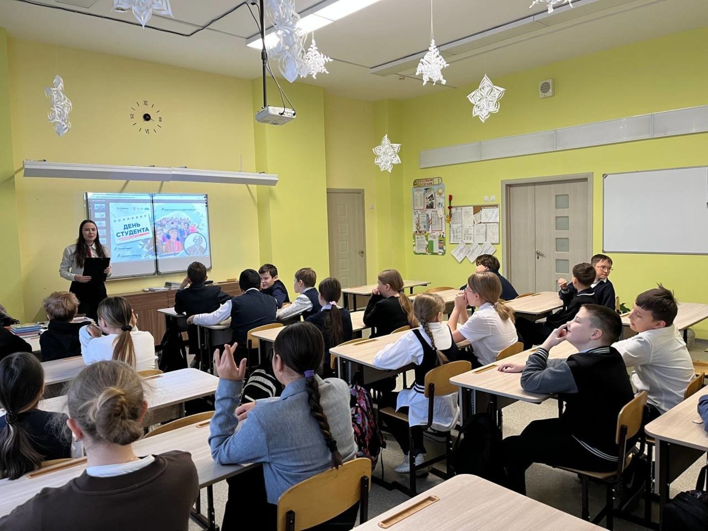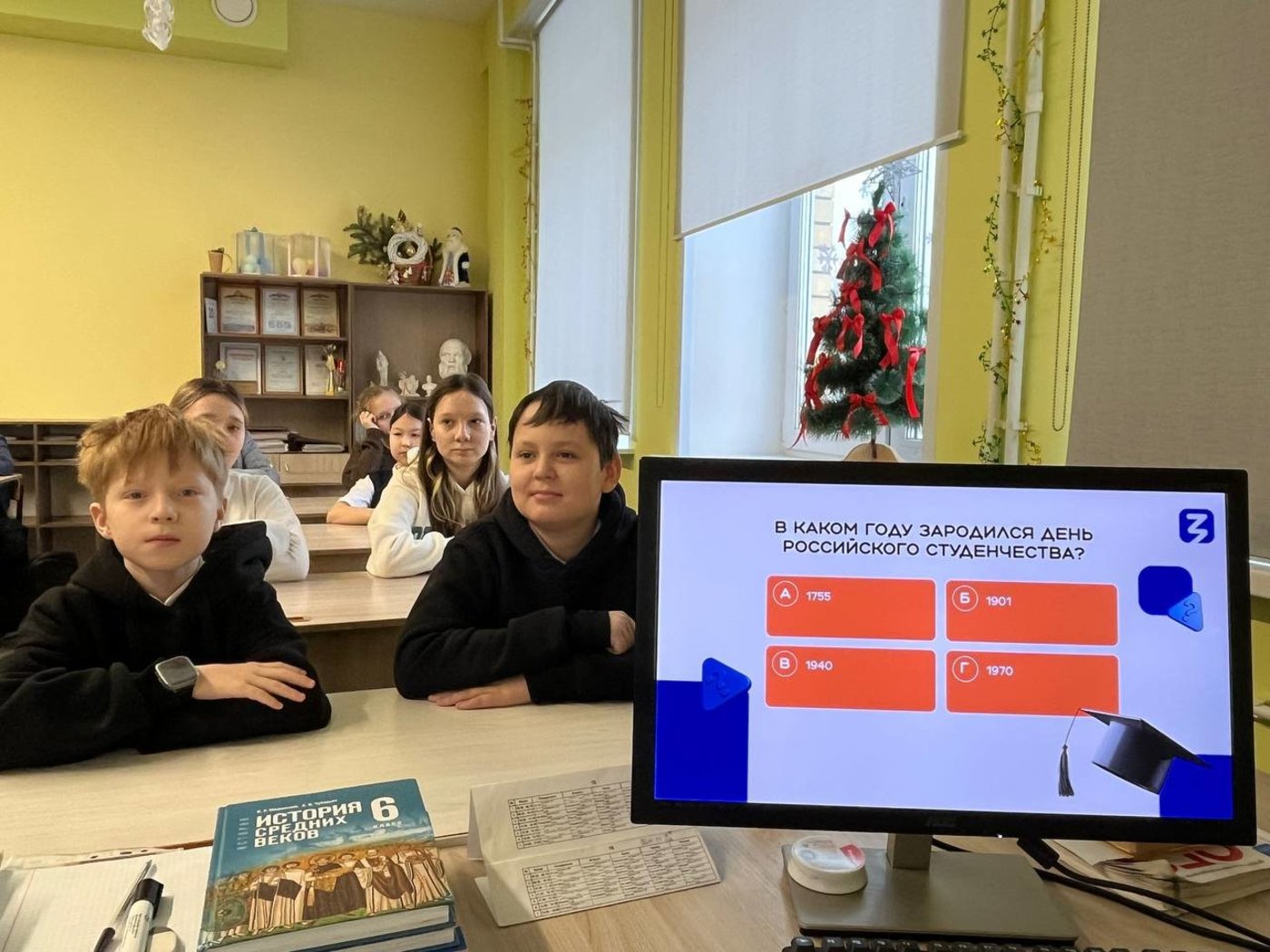 Учащиеся окунулись в прошлое, посмотрев видеоролик об истории Дня российского студенчества, и с интересом отвечали на каверзные вопросы: