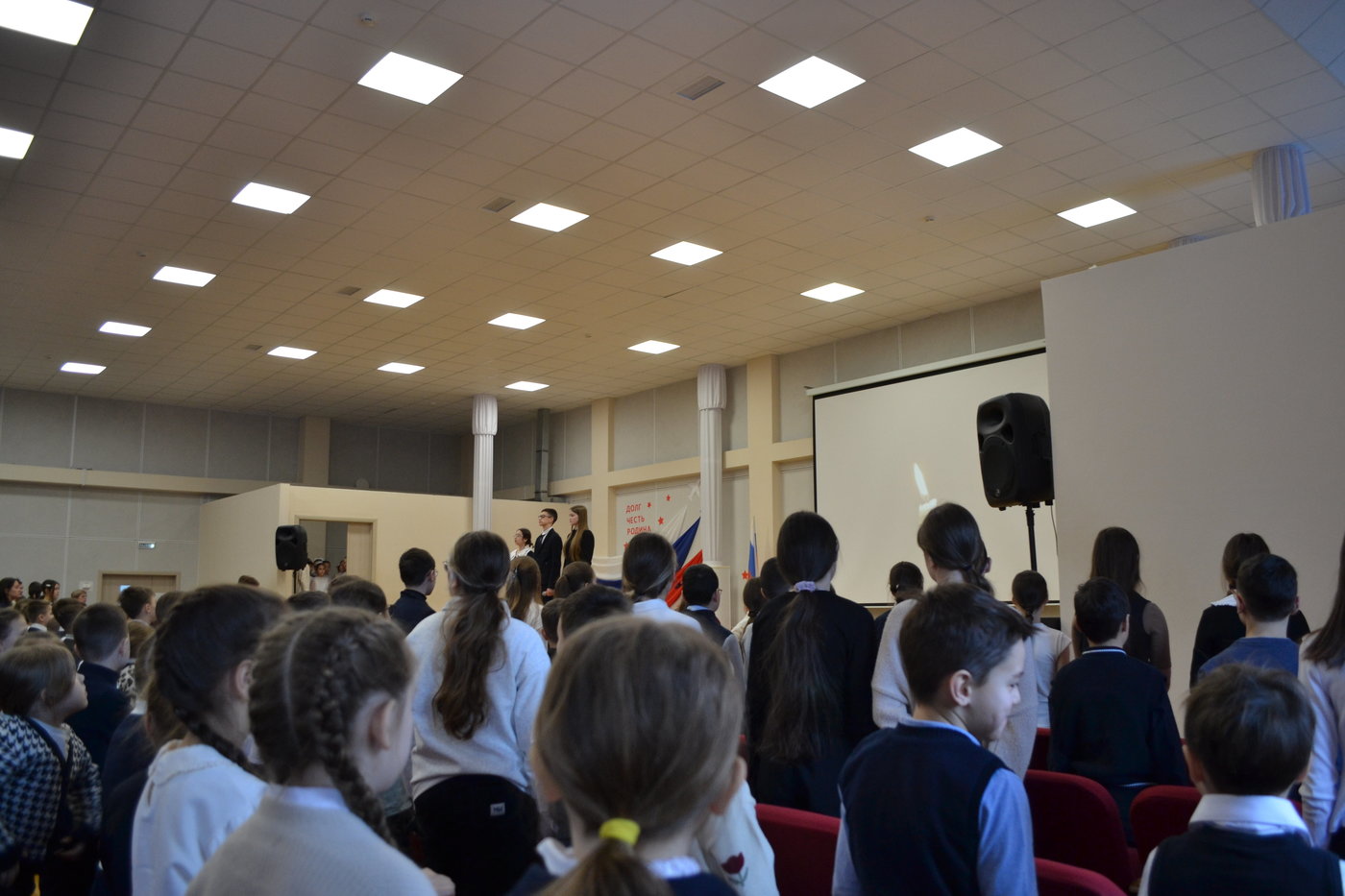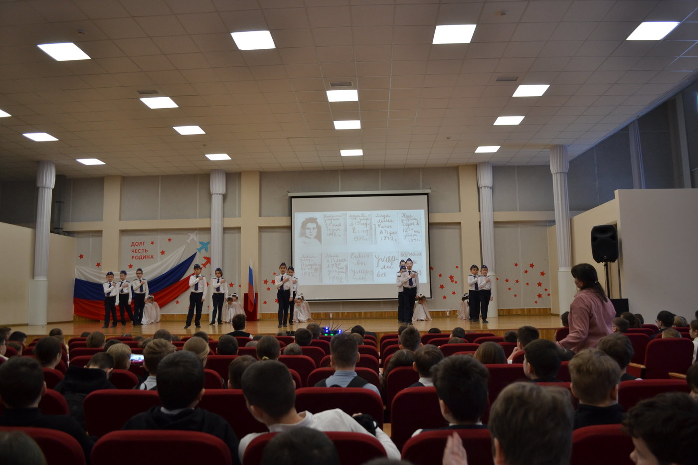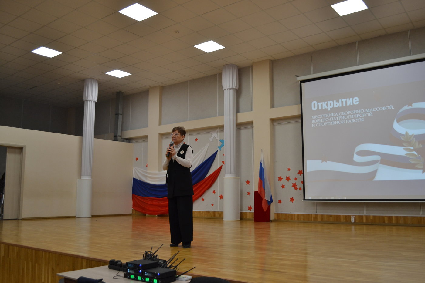 Мероприятие началось с выноса знамени Российской Федерации знамённой группой школы, затем с приветственным словом выступила директор школы Николаева Т. Л. Она отметила важность данного месячника, пожелала ребятам принимать участие во всех мероприятиях.