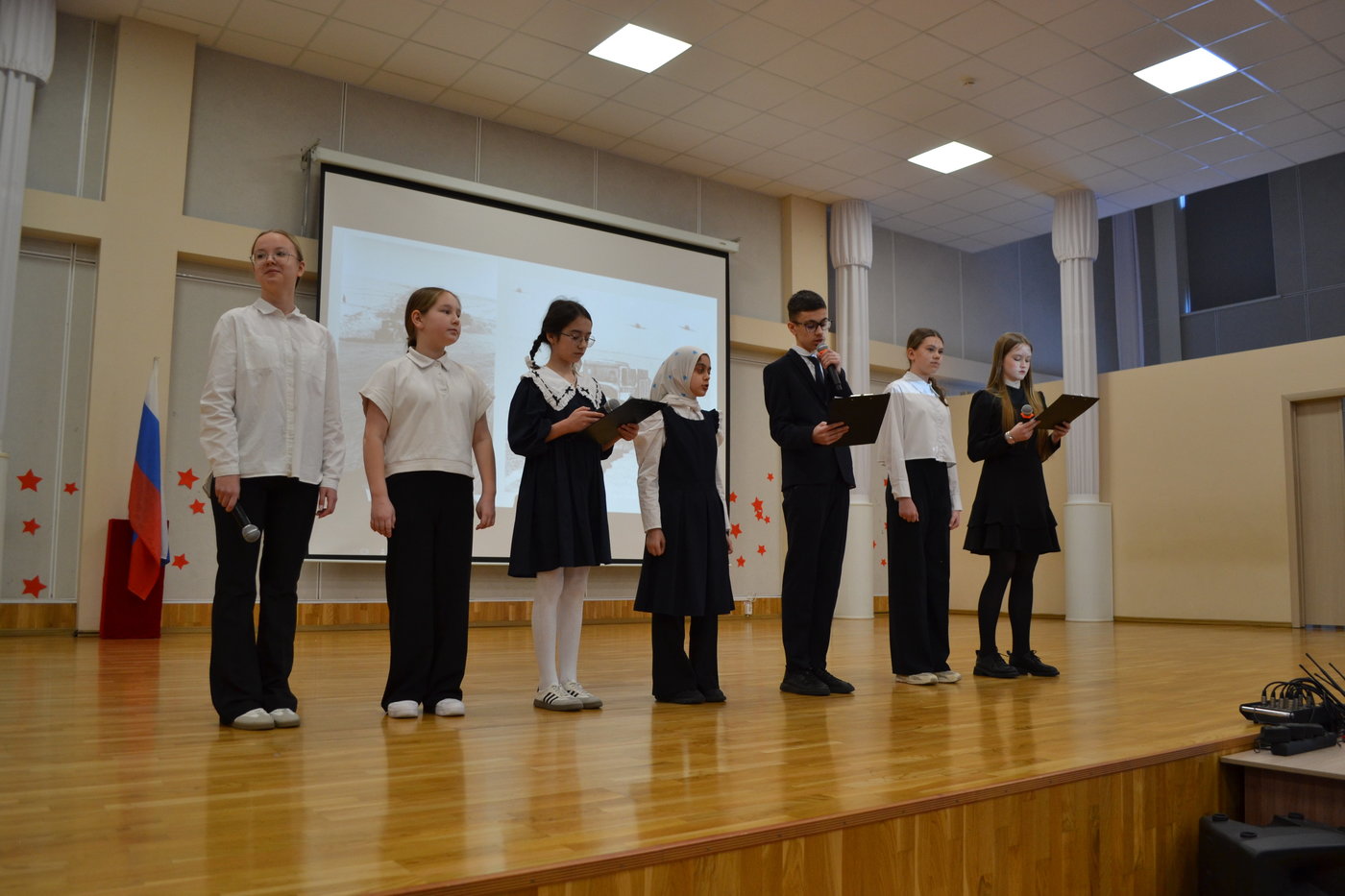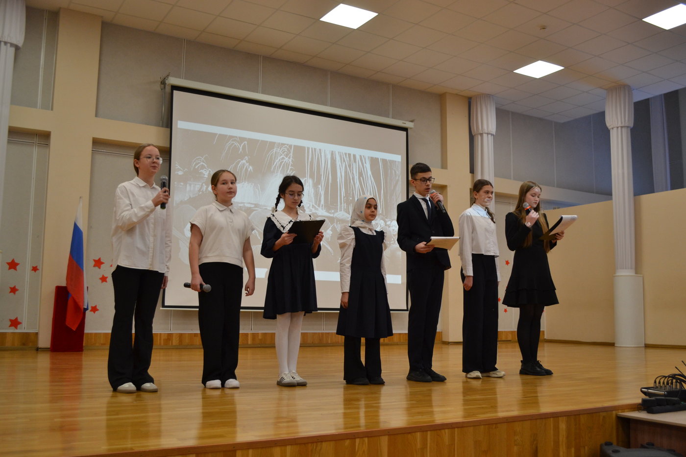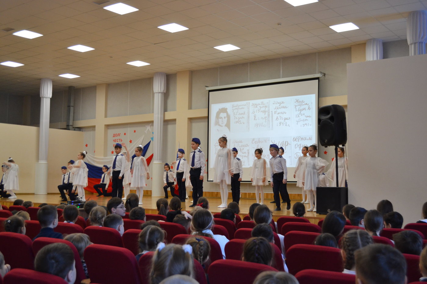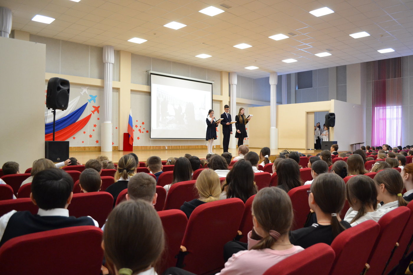 Мероприятие началось с выноса знамени Российской Федерации знамённой группой школы, затем с приветственным словом выступила директор школы Николаева Т. Л. Она отметила важность данного месячника, пожелала ребятам принимать участие во всех мероприятиях.