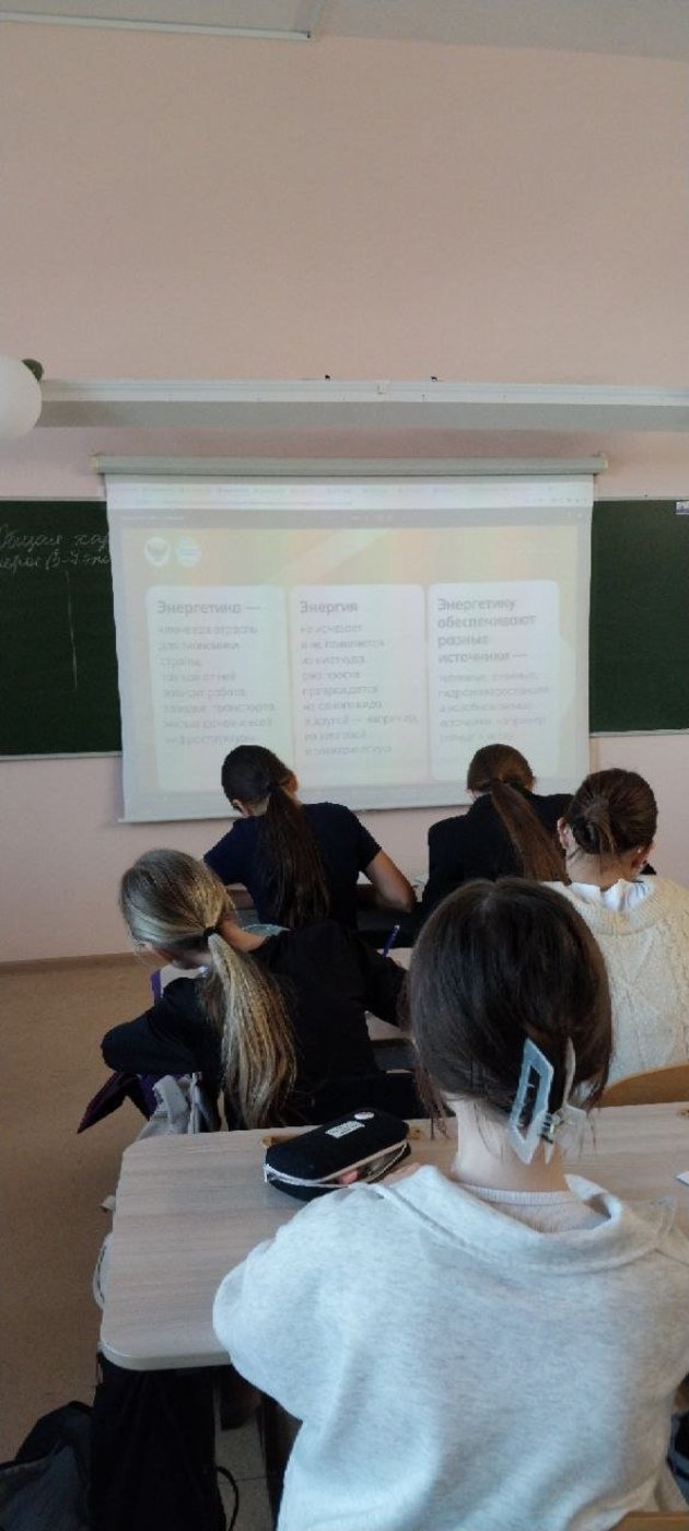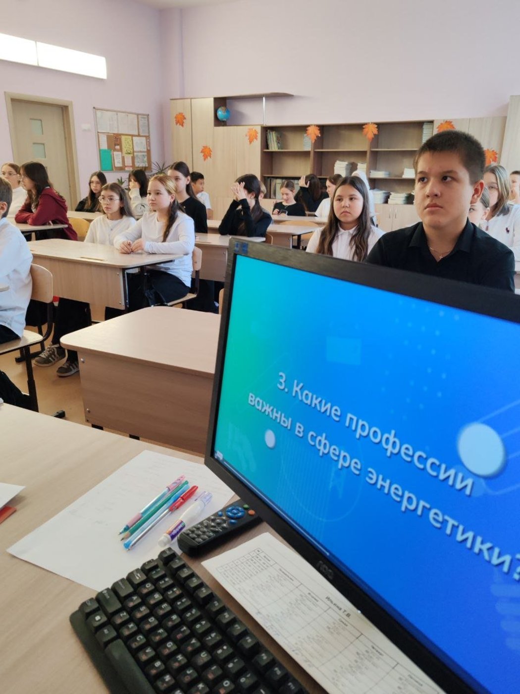 На занятии ученики 6-11 классов обсудили, как работает энергетическая система, что делает Россию одной из самых энергообеспеченных стран, и рассмотрели перспективы отрасли. Ребята познакомились с профессиями, они узнали, кто такие инженеры-энергетики, электромонтёры, специалисты по энергосбережению и почему их работа так важна.