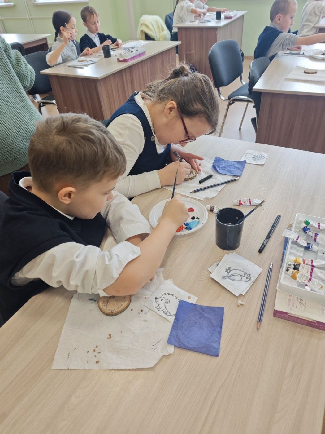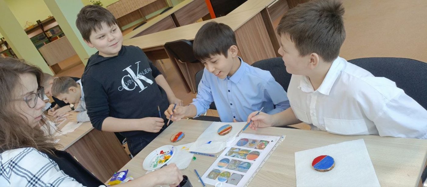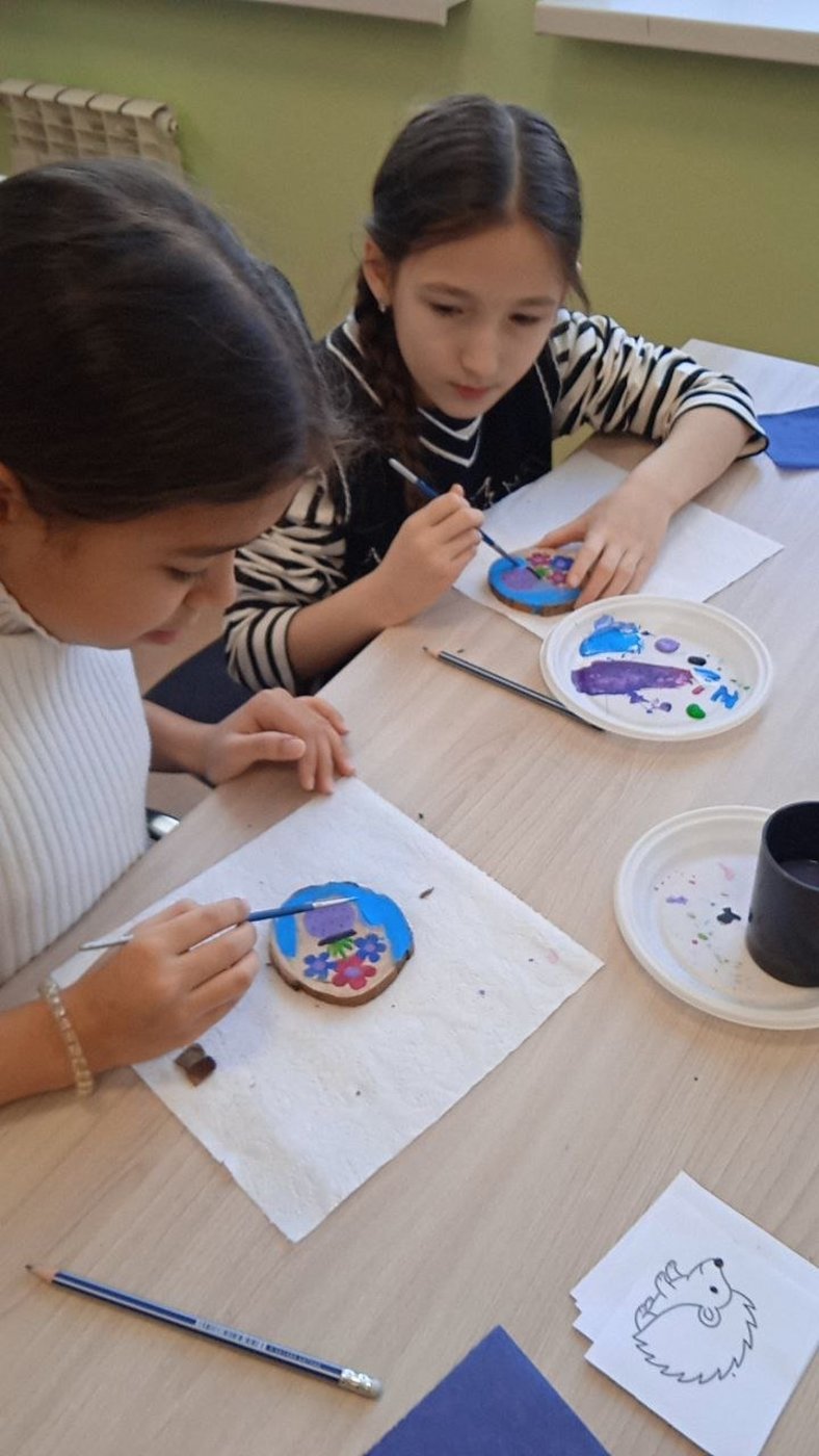 После экскурсии по выставке, у ребят была возможность самим на мастер-классе нарисовать на спиле дерева небольшую картину.