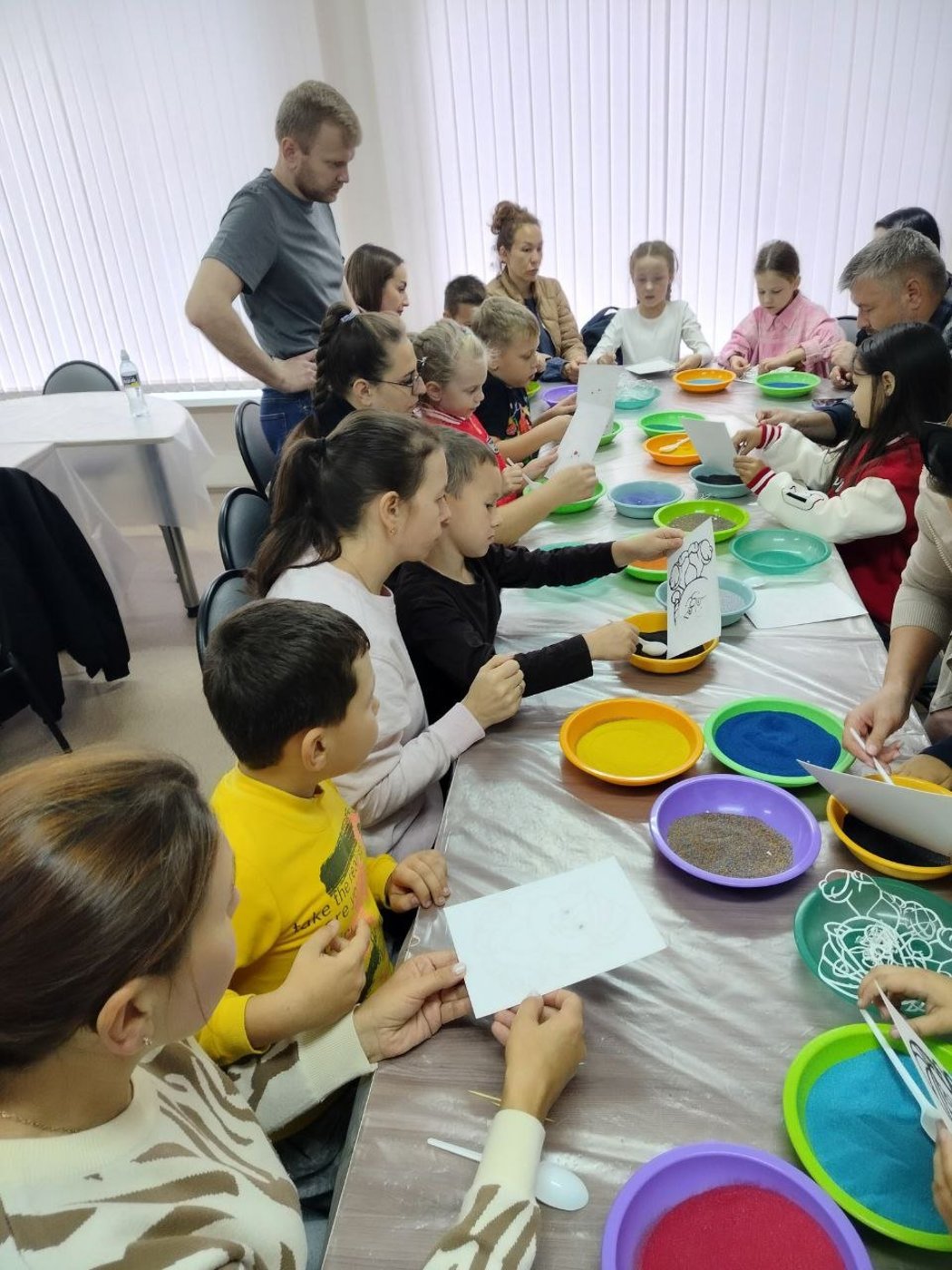 Посмотрели в стереоскоп вместе с родителями, а потом на мастер-классе рисовали песком.