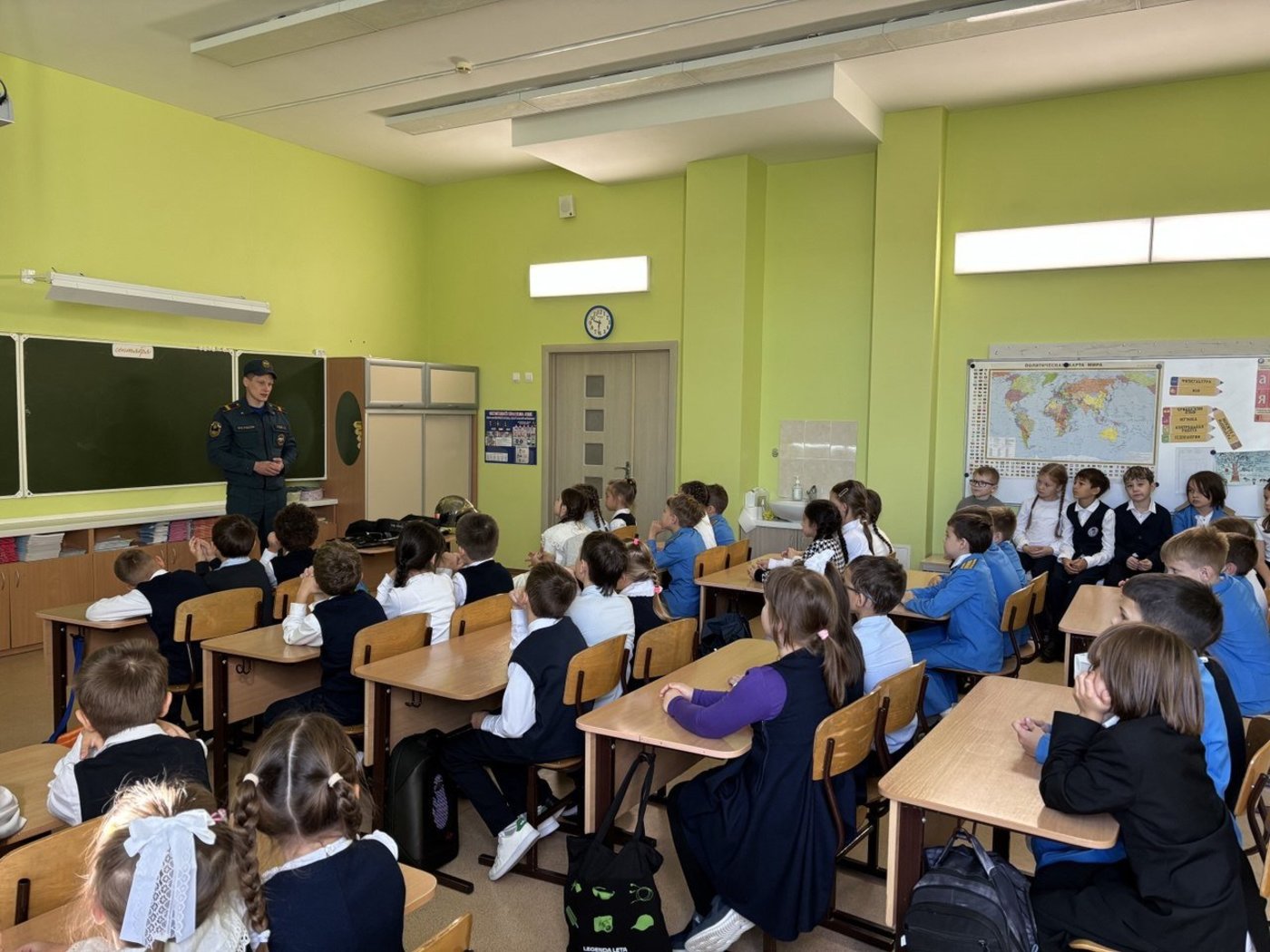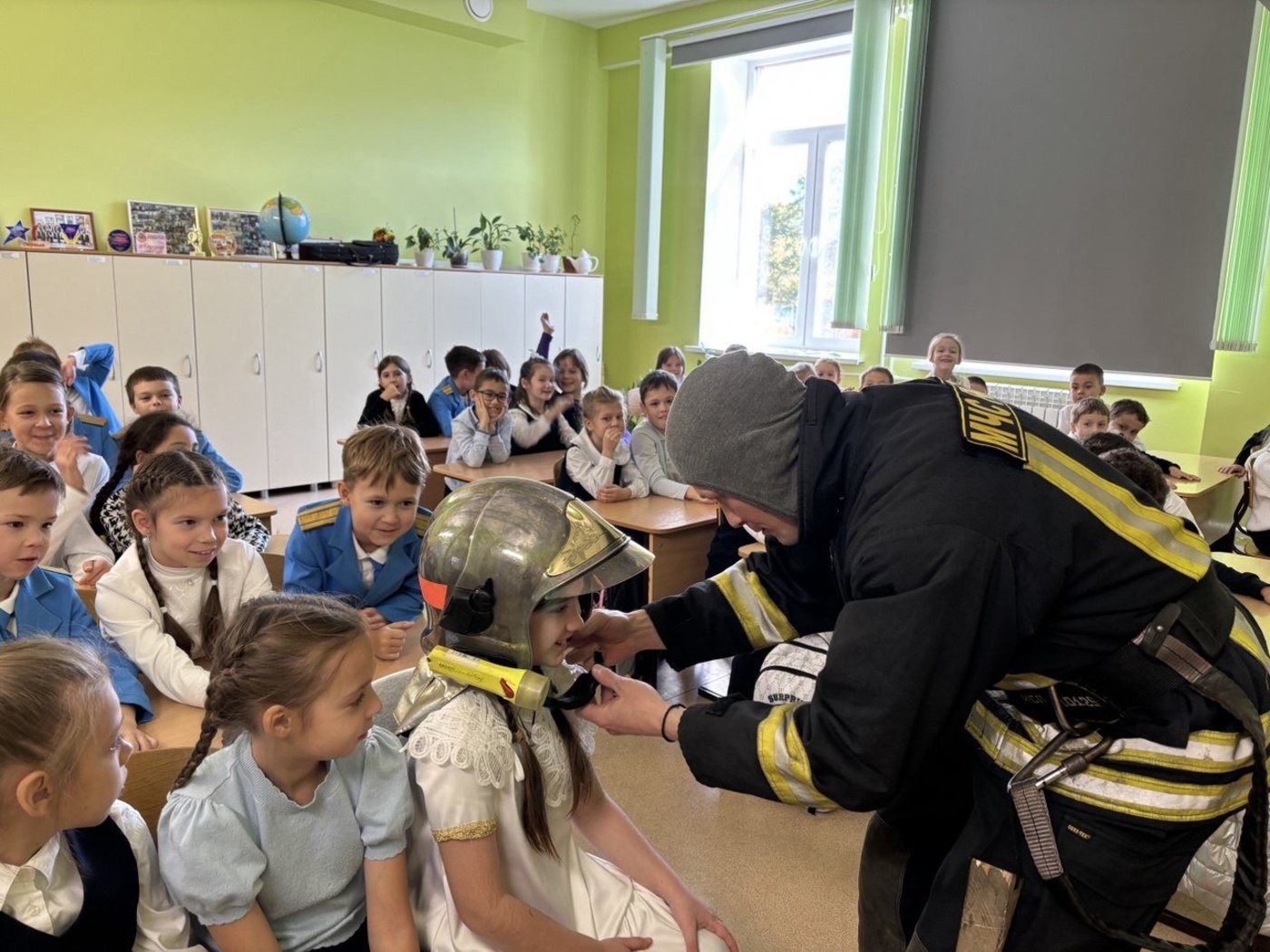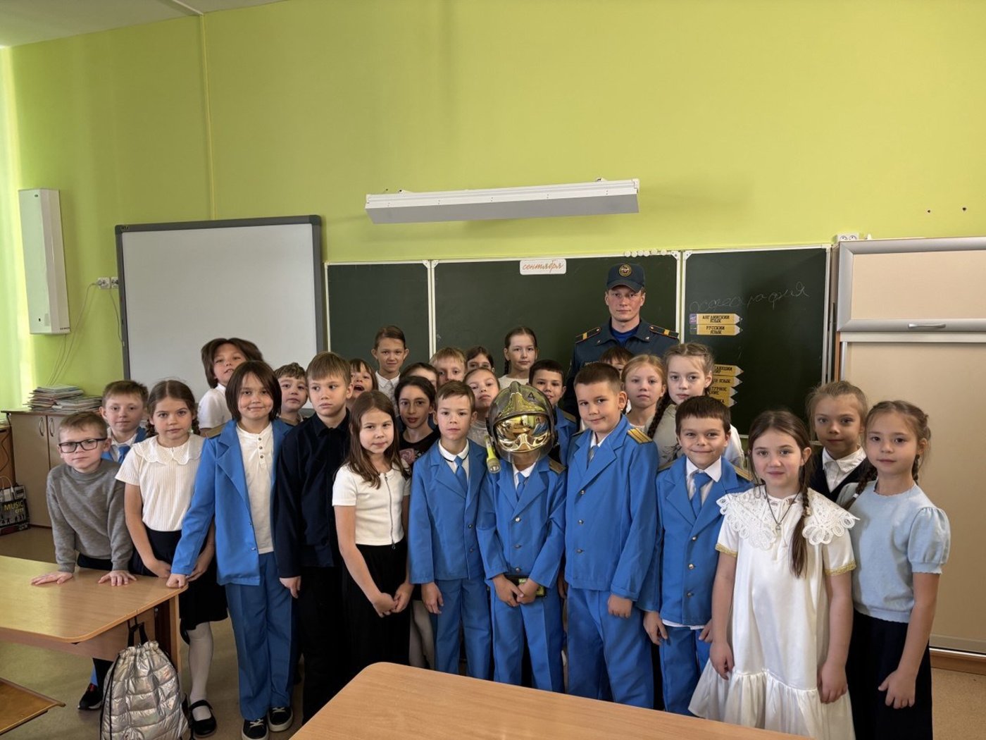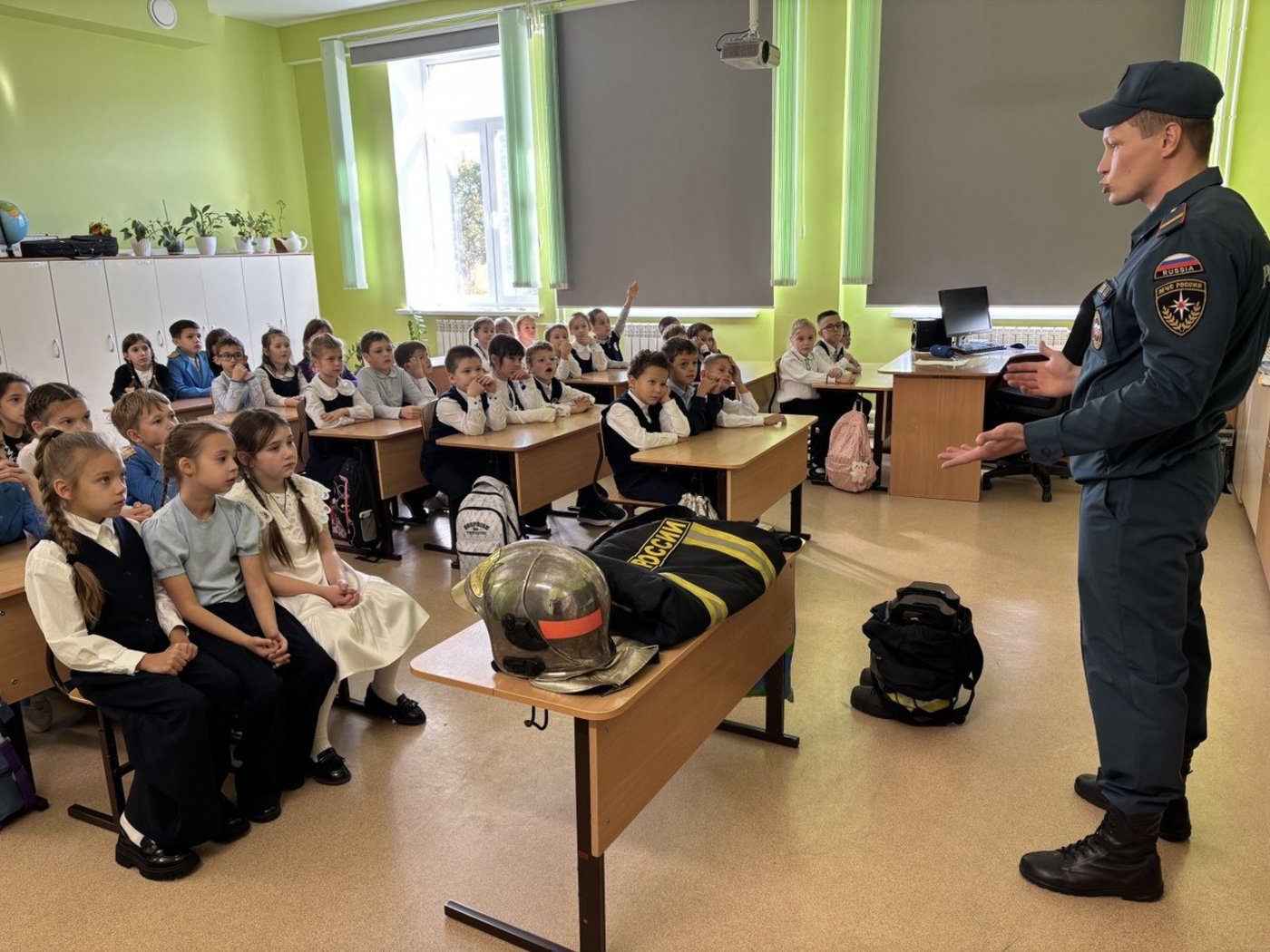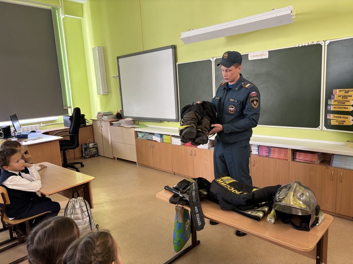 В 3И классе провел урок безопасности Пудов Александр Александрович, помощник начальника караула Пожарно-спасательной части № 4. Он напомнил третьеклассникам о правилах поведения во время пожара, продемонстрировал экипировку пожарного.