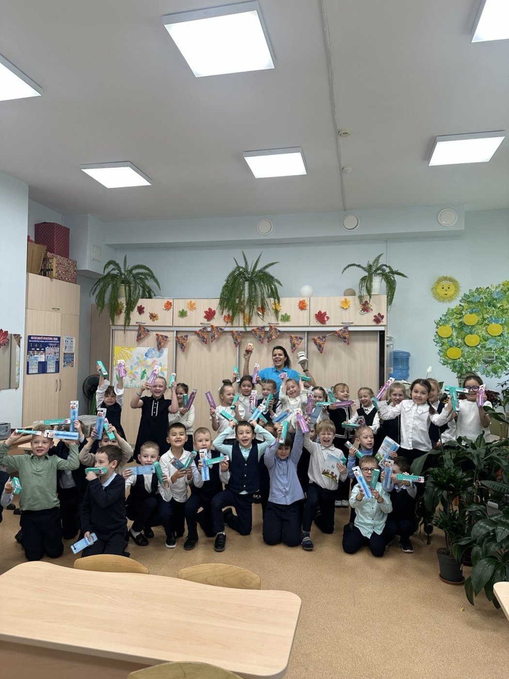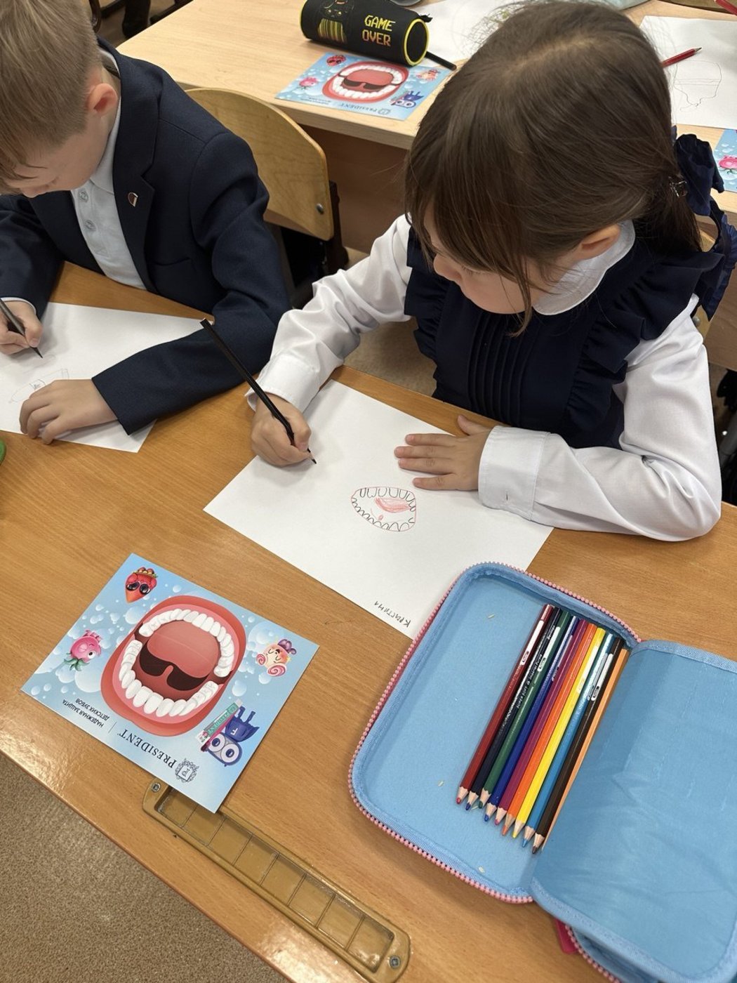 В конце урока ребята нарисовали замечательные рисунки, на которых постарались изобразить все, что узнали. Каждый получил в подарок зубную щетку и зубную пасту!