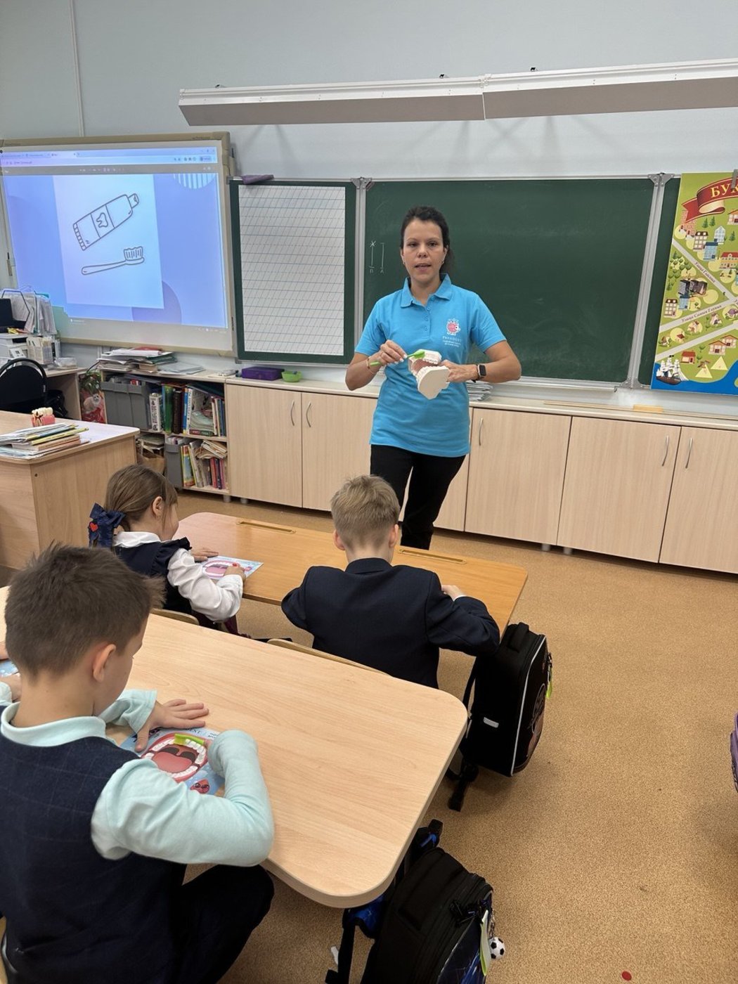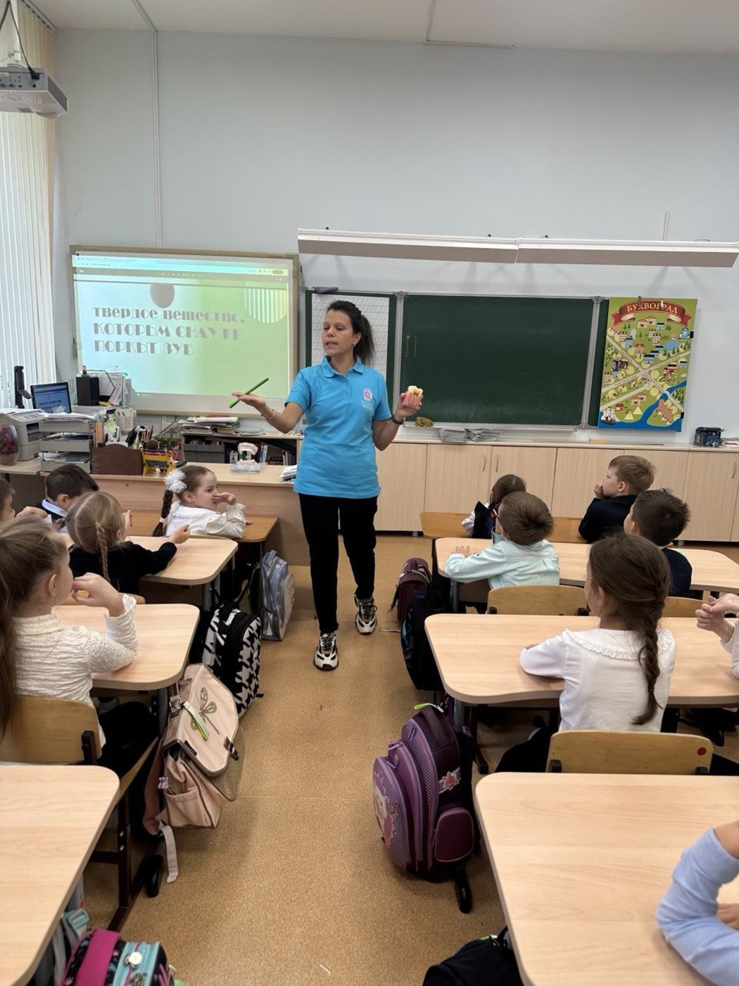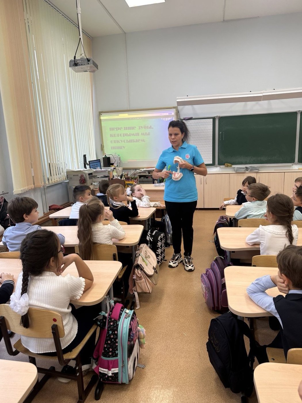 Сегодня в 1Б классе урок гигиены провела врач- стоматолог Альбина Файзенуровна Ганеева.