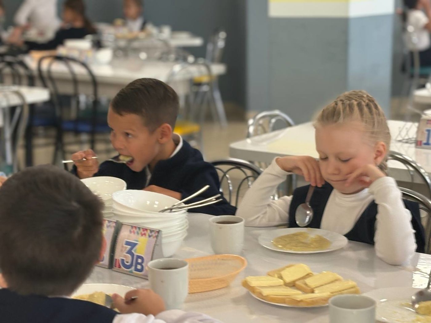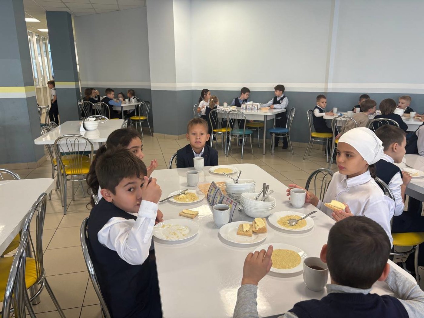 А еще говорят: "За общим столом и еда вкуснее". Пшенная каша, бутерброд с маслом и чай с лимоном показались первоклашкам сегодня особенно аппетитными.
